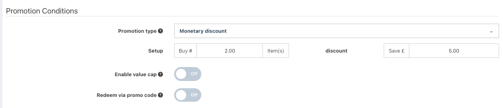 For a Monetary discount promotion, specify how many items a customer needs to buy and the fixed amount discount they will receive e.g. Buy 2 Save £5.
