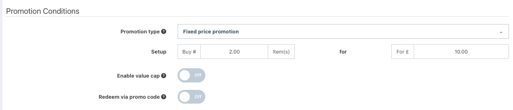 For a Fixed price promotion, specify many items a customer needs to buy and the fixed price they will pay for them e.g. Buy 2 for £10.