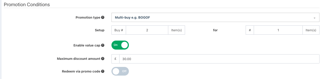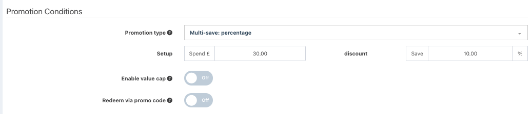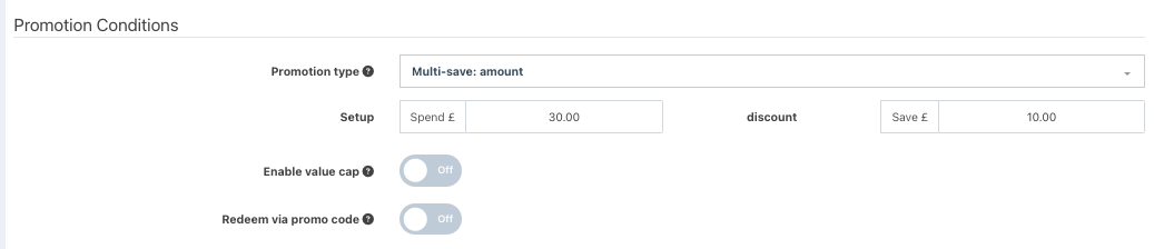 For a Multi-save: amount promotion, specify how much a customer needs to spend and the fixed amount discount they will receive e.g. Spent £30 save £5.