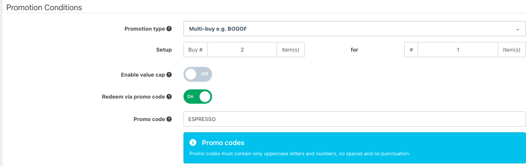 You are also able to set a Value cap for your promotion and add a Redemption code. If your promotion requires a code, your customers will enter this when making their purchase.