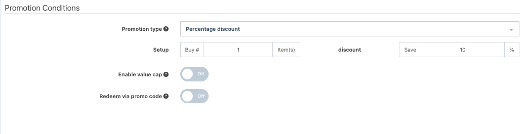 For a Percentage discount promotion, specify how many items a customer needs to buy and the % discount they will receive e.g. Buy 1 Save 10%.