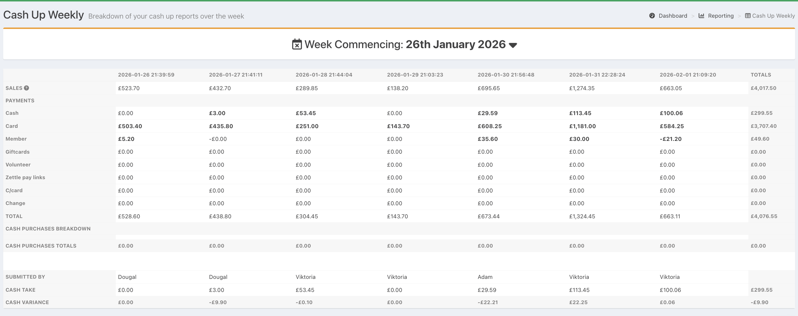 You will then see combined figures from all cash ups run during the selected week.
